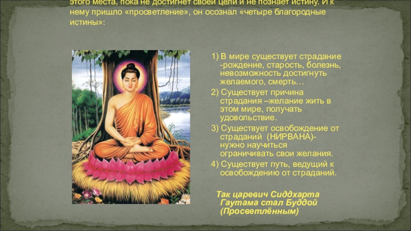 не сойдёт с этого места, пока не достигнет своей цели и не познает истину. И к нему пришло «просветление», он осознал «четыре благородные истины»: