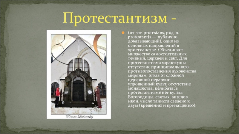 из основных направлений в христианстве. Объединяет множество самостоятельных течений, церквей и сект. Для протестантизма характерны отсутствие принципиального противопоставления духовенства мирянам, отказ от сложной церковной иерархии, упрощенный культ, отсутствие монашества, целибата; в протестантизме нет культа Богородицы, святых, ангелов, икон, число таинств сведено к двум (крещению и причащению).