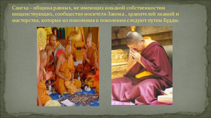 Слайд 34Сангха – община равных, не имеющих никакой собственностии нищенствующих, сообщество носителя