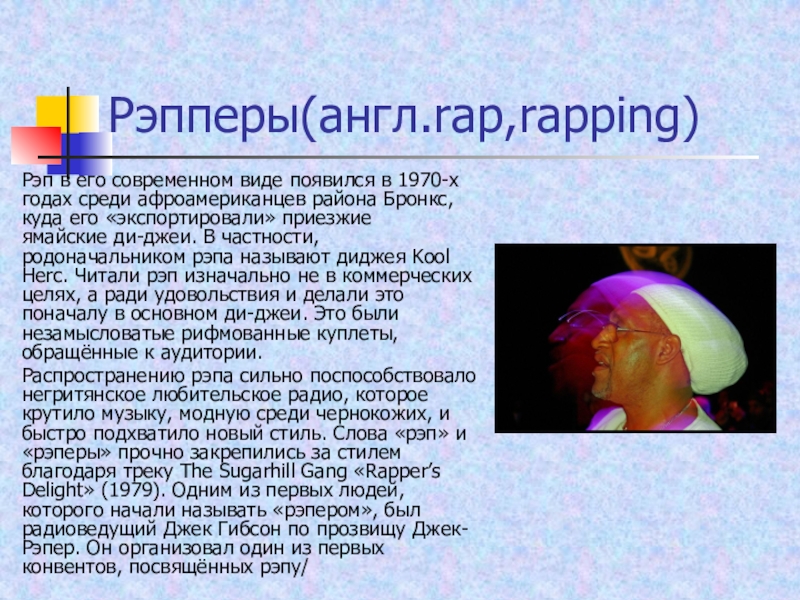 «экспортировали» приезжие ямайские ди-джеи. В частности, родоначальником рэпа называют диджея Kool Herc. Читали рэп изначально не в коммерческих целях, а ради удовольствия и делали это поначалу в основном ди-джеи. Это были незамысловатые рифмованные куплеты, обращённые к аудитории.