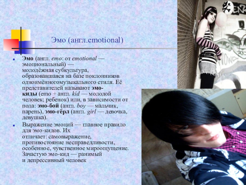 базе поклонников одноимённогомузыкального стиля. Её представителей называют эмо-киды (emo + англ. kid — молодой человек; ребенок) или, в зависимости от пола: эмо-бой (англ. boy — мальчик, парень), эмо-гёрл (англ. girl — девочка, девушка).