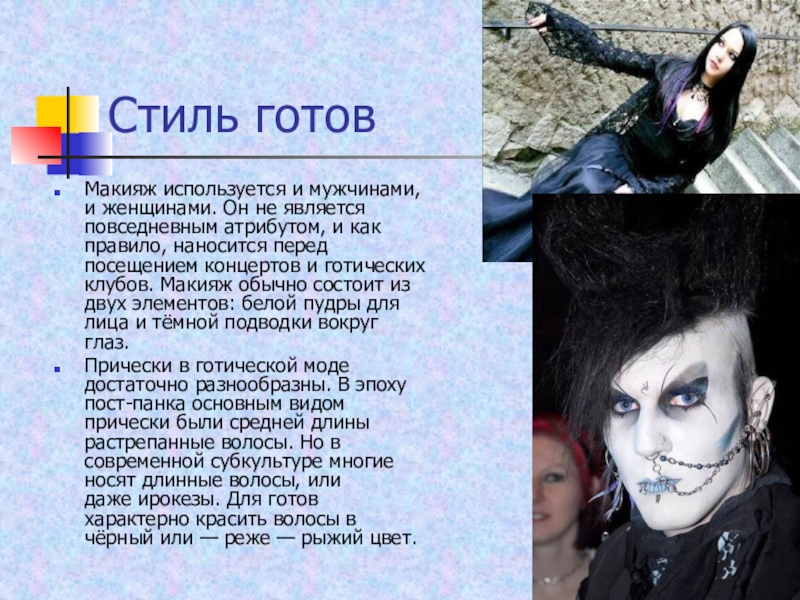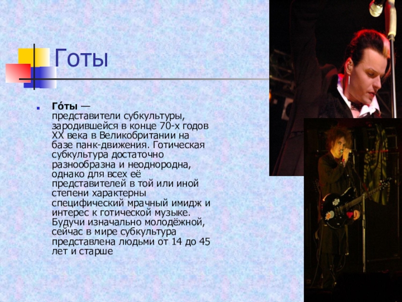 на базе панк-движения. Готическая субкультура достаточно разнообразна и неоднородна, однако для всех её представителей в той или иной степени характерны специфический мрачный имидж и интерес к готической музыке. Будучи изначально молодёжной, сейчас в мире субкультура представлена людьми от 14 до 45 лет и старше