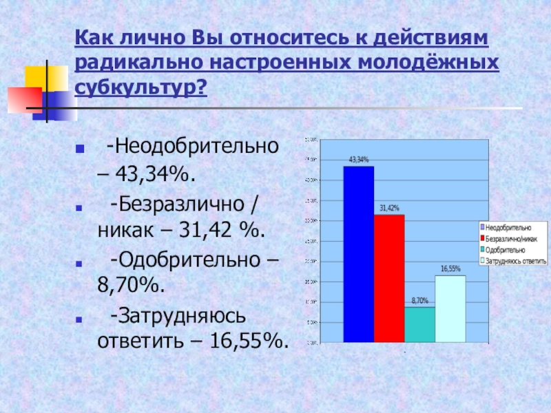 Слайд 15Как лично Вы относитесь к действиям радикально настроенных молодёжных субкультур?
