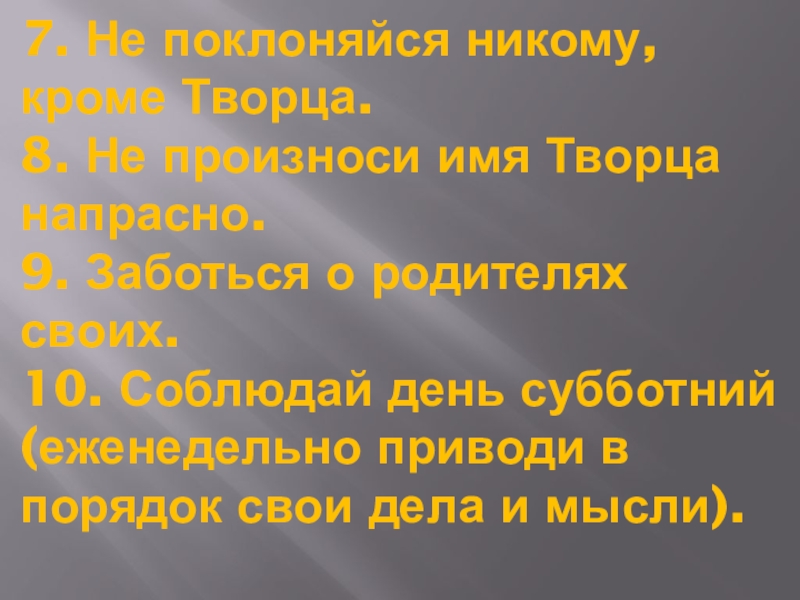 7. Не поклоняйся никому, кроме Творца.  8. Не произноси имя Творца напрасно. 9. Заботься о родителях