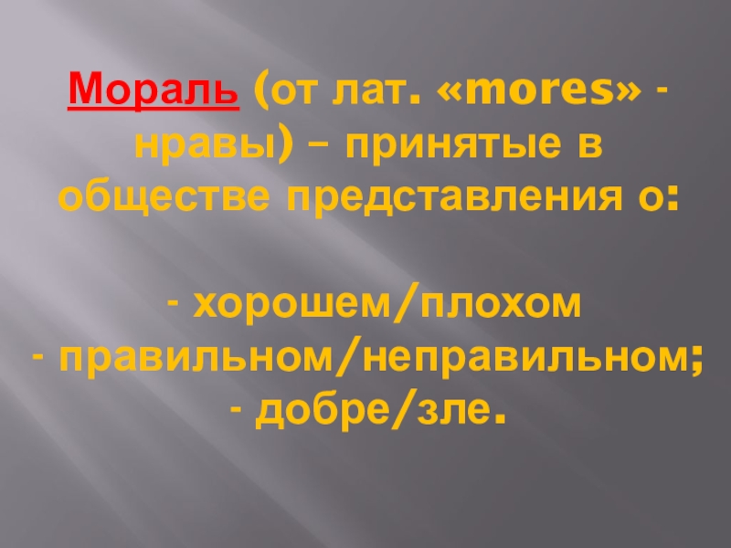 Мораль (от лат. «mores» - нравы) – принятые в обществе представления о: - хорошем/плохом - правильном/неправильном; - добре/зле.