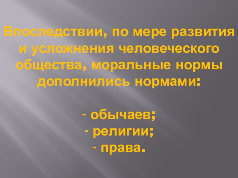 Слайд 19Впоследствии, по мере развития и усложнения человеческого общества, моральные нормы дополнились