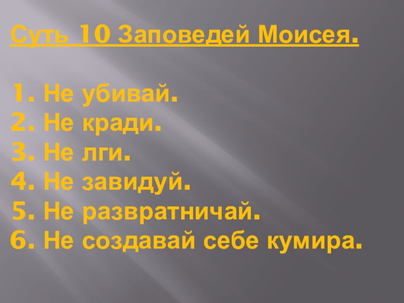 Суть 10 Заповедей Моисея.   1. Не убивай. 2. Не кради. 3. Не лги. 4. Не