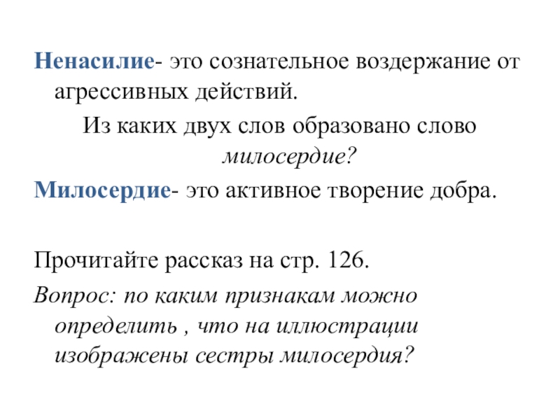 Ненасилие- это сознательное воздержание от агрессивных действий.Из каких двух слов образовано слово милосердие?Милосердие- это активное творение добра.Прочитайте