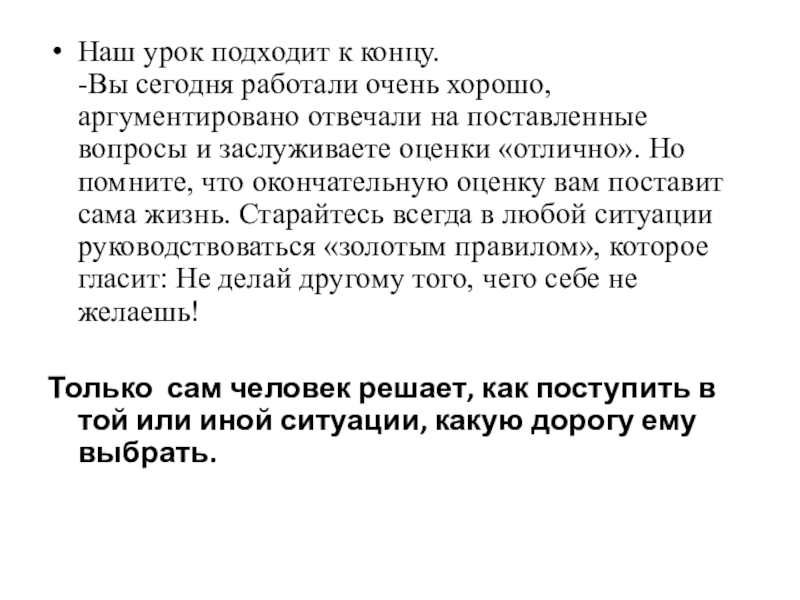 отвечали на поставленные вопросы и заслуживаете оценки «отлично». Но помните, что окончательную оценку вам поставит сама жизнь. Старайтесь всегда в любой ситуации руководствоваться «золотым правилом», которое гласит: Не делай другому того, чего себе не желаешь!