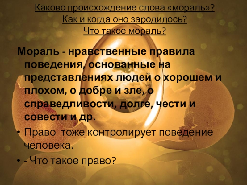 Мораль зародилась в глубокой древности, на заре возникновения человечества. Внимательно наблюдая жизнь, деятельность, поступки, нравы, люди тщательно их обдумывали и, наконец, сформулировали четко определенное правило поведения. Это и есть мораль – результат, продукт размышления о жизни, делах, поступках людей. К морали относятся определенные принципы, идеалы, мудрые правила, которые регулируют, строго направляют поведение людей. К ним относятся принципы любви к человеку, милосердия или такие нормы, как «не убий», «не воруй», «не лги», «почитай старших» и т.д. Эти правила нашли отражение во всех религиях мира – у христиан в священной книге Библии, у мусульман в священной книге Коране, у иудеев в священной книге Торе, в древних буддийских, индийских и китайских верованиях.