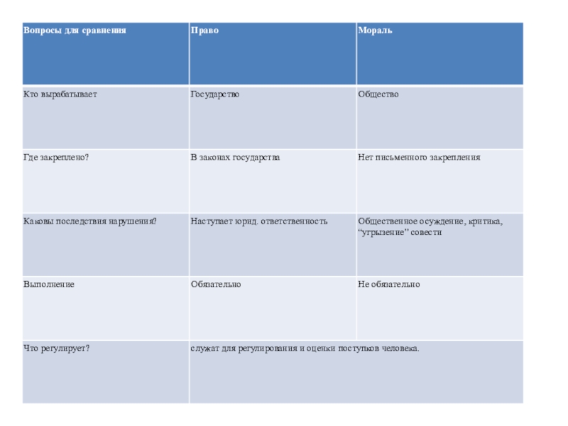 что отличает? Давайте сравним этих два регулятора жизни- право и мораль и заполним результат в таблице.