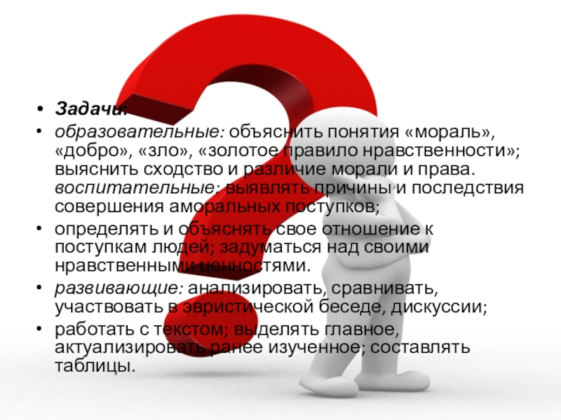образовательные: объяснить понятия «мораль», «добро», «зло», «золотое правило нравственности»; выяснить сходство и