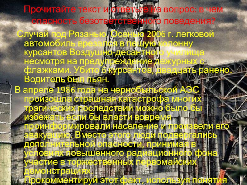 Слайд 13Прочитайте текст и ответьте на вопрос: в чем опасность безответственного поведения?