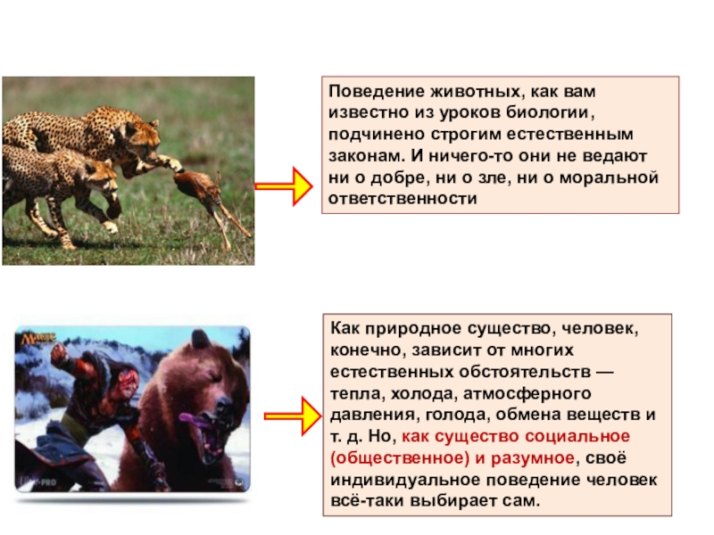 Как природное существо, человек, конечно, зависит от многих естественных обстоятельств — тепла, холода, атмосферного давления, голода, обмена веществ и т. д. Но, как существо социальное (общественное) и разумное, своё индивидуальное поведение человек всё-таки выбирает сам.