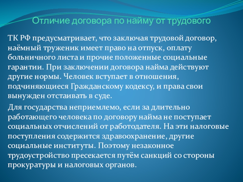трудовой договор, наёмный труженик имеет право на отпуск, оплату больничного листа и прочие положенные социальные гарантии. При заключении договора найма действуют другие нормы. Человек вступает в отношения, подчиняющиеся Гражданскому кодексу, и права свои вынужден отстаивать в суде.