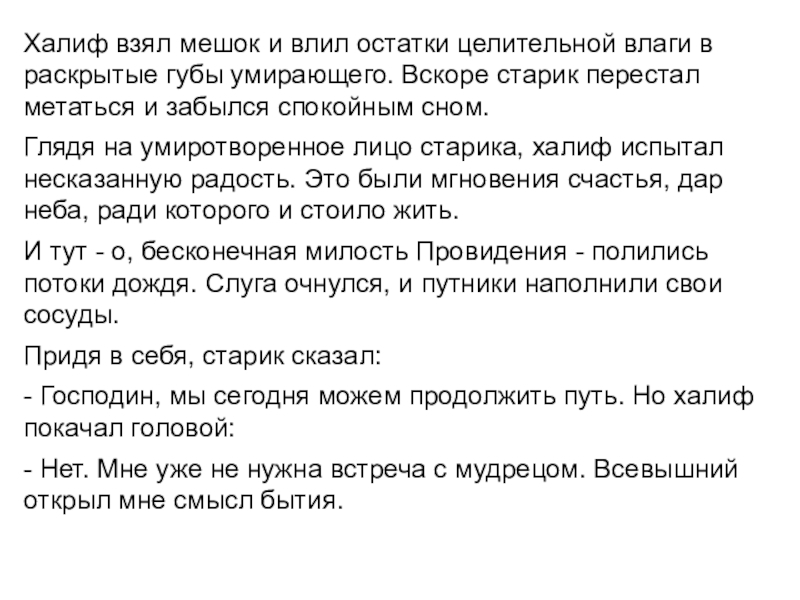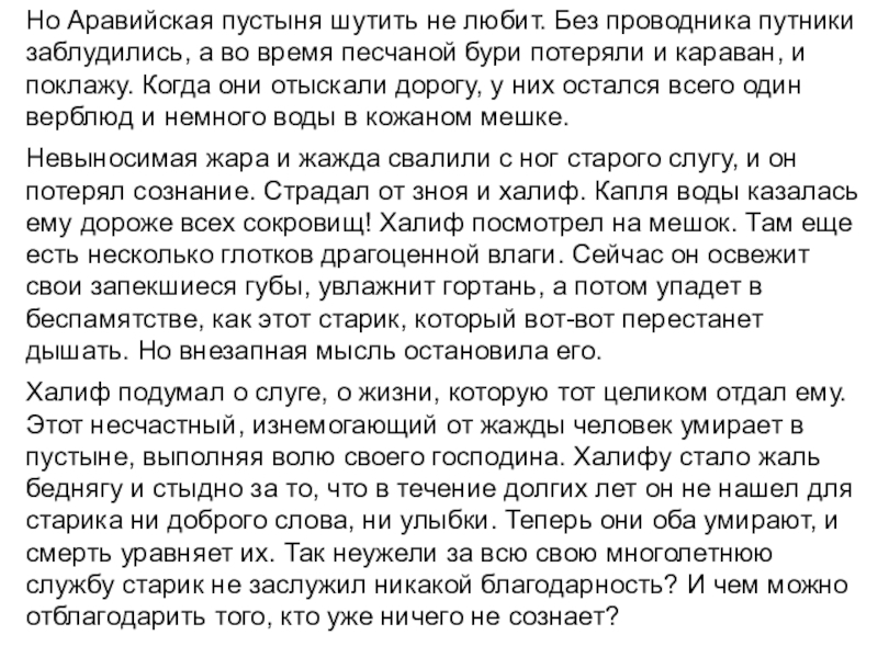 Халиф подумал о слуге, о жизни, которую тот целиком отдал ему. Этот несчастный, изнемогающий от жажды человек умирает в пустыне, выполняя волю своего господина. Халифу стало жаль беднягу и стыдно за то, что в течение долгих лет он не нашел для старика ни доброго слова, ни улыбки. Теперь они оба умирают, и смерть уравняет их. Так неужели за всю свою многолетнюю службу старик не заслужил никакой благодарность? И чем можно отблагодарить того, кто уже ничего не сознает?