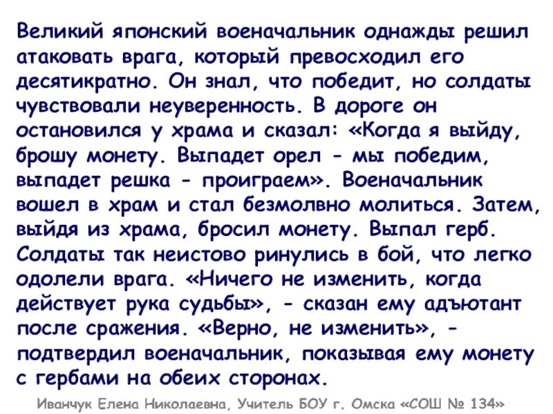 Слайд 16Великий японский военачальник однажды решил атаковать врага, который превосходил его десятикратно.