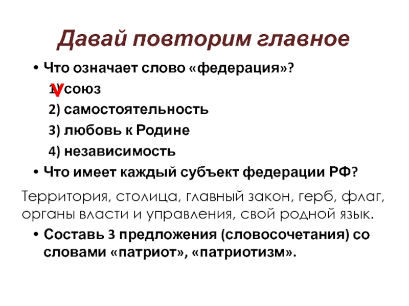 Территория, столица, главный закон, герб, флаг, органы власти и управления, свой родной язык.