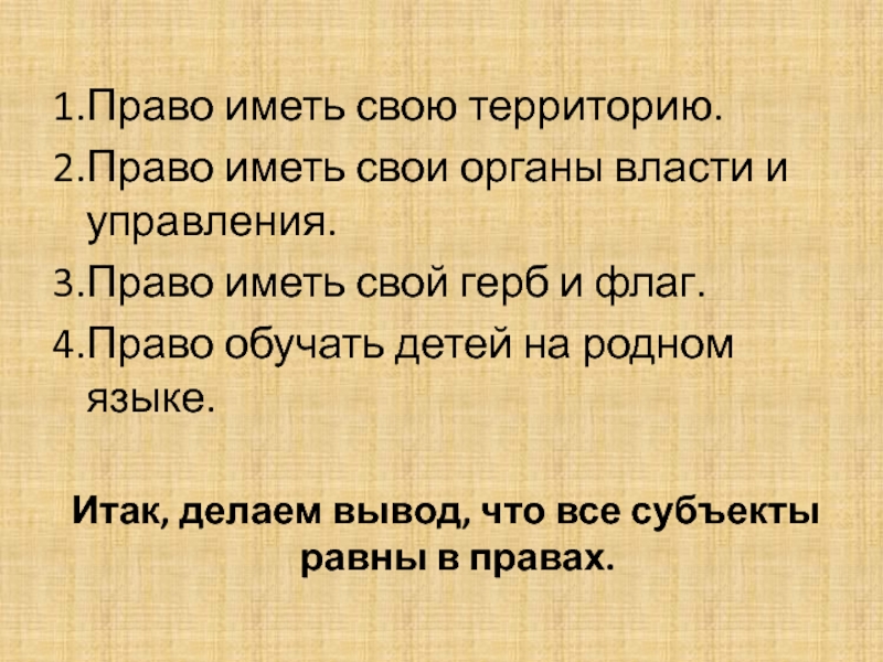 равные права. А теперь давайте с вами найдем в учебнике (стр.92) права субъектов РФ и зачитаем их: