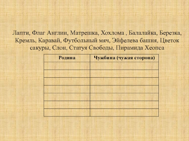 Лапти, Флаг Англии, Матрешка, Хохлома , Балалайка, Березка, Кремль, Каравай, Футбольный мяч,