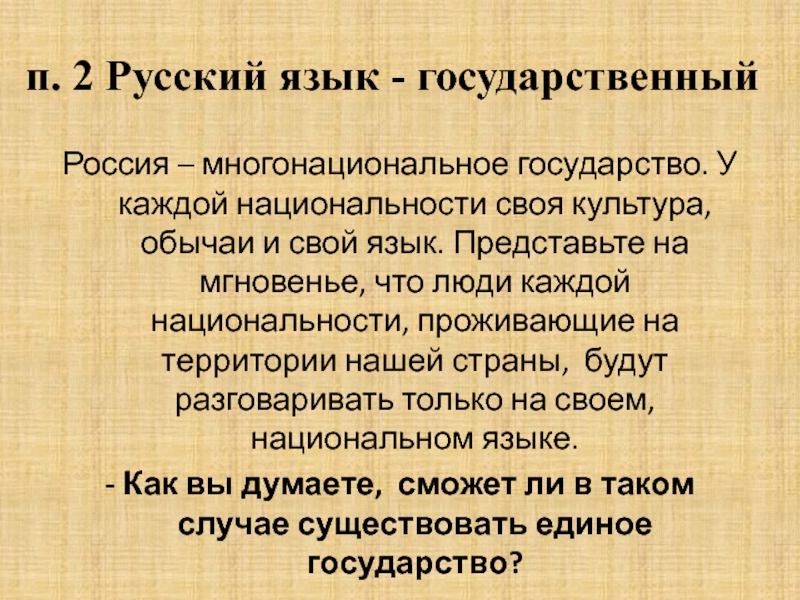 национальности своя культура, обычаи и свой язык. Представьте на мгновенье, что люди каждой национальности, проживающие на территории нашей страны, будут разговаривать только на своем, национальном языке.