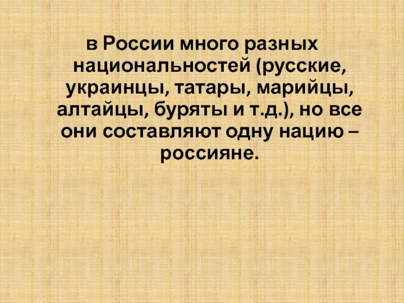 Слайд 19в России много разных национальностей (русские, украинцы, татары, марийцы, алтайцы, буряты