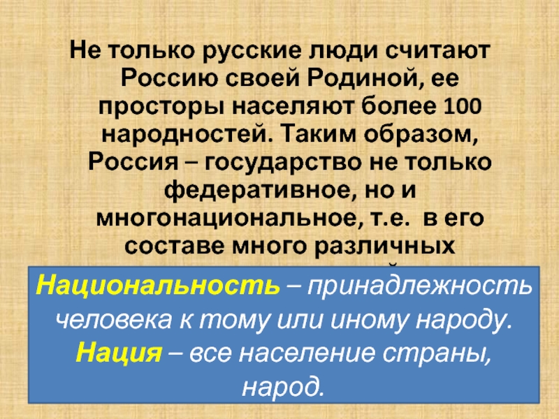более 100 народностей. Таким образом, Россия – государство не только федеративное, но и многонациональное, т.е. в его составе много различных национальностей.