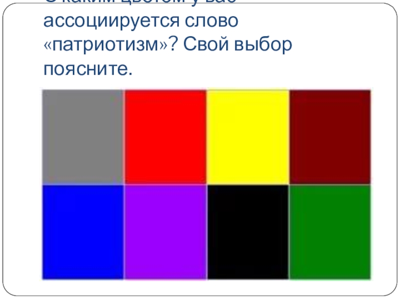 Слайд 18С каким цветом у вас ассоциируется слово «патриотизм»? Свой выбор поясните.