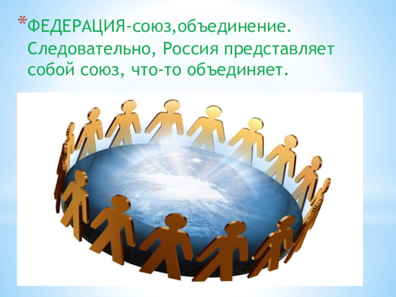 ФЕДЕРАЦИЯ-союз,объединение. Следовательно, Россия представляет собой союз, что-то объединяет.