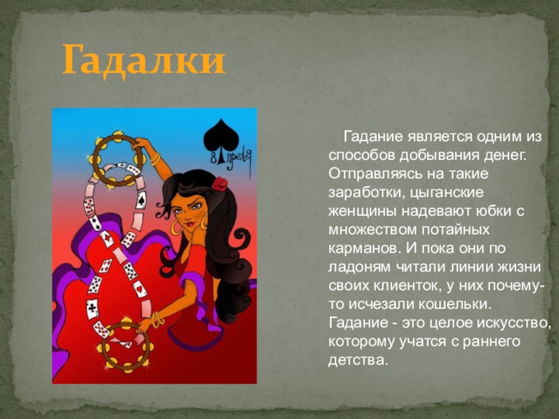 на такие заработки, цыганские женщины надевают юбки с множеством потайных карманов. И пока они по ладоням читали линии жизни своих клиенток, у них почему-то исчезали кошельки. Гадание - это целое искусство, которому учатся с раннего детства.