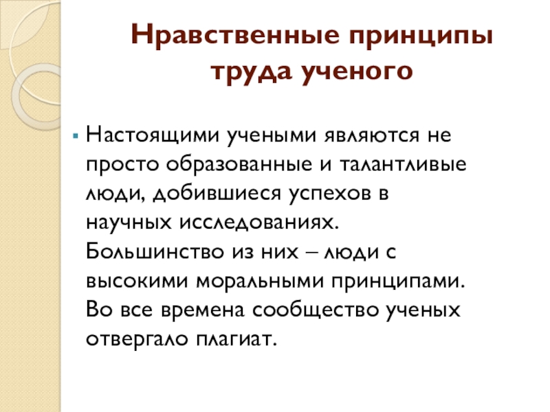 Нравственные принципы труда ученогоНастоящими учеными являются не просто образованные и талантливые люди, добившиеся успехов в научных исследованиях.