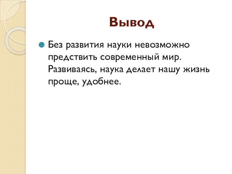 ВыводБез развития науки невозможно предствить современный мир. Развиваясь, наука делает нашу жизнь проще, удобнее.