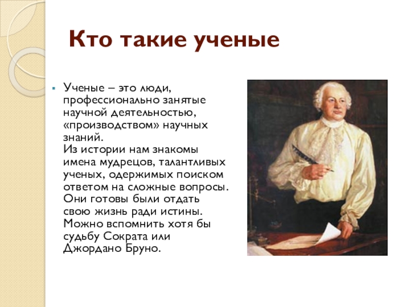 Кто такие ученые Ученые – это люди, профессионально занятые научной деятельностью, «производством» научных знаний. Из истории нам