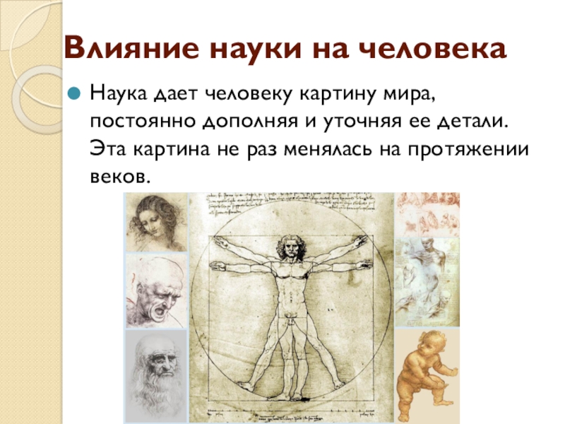Влияние науки на человекаНаука дает человеку картину мира, постоянно дополняя и уточняя ее детали.  Эта картина