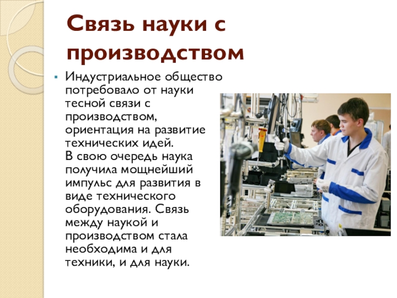 Связь науки с производствомИндустриальное общество потребовало от науки тесной связи с производством, ориентация на развитие технических идей.