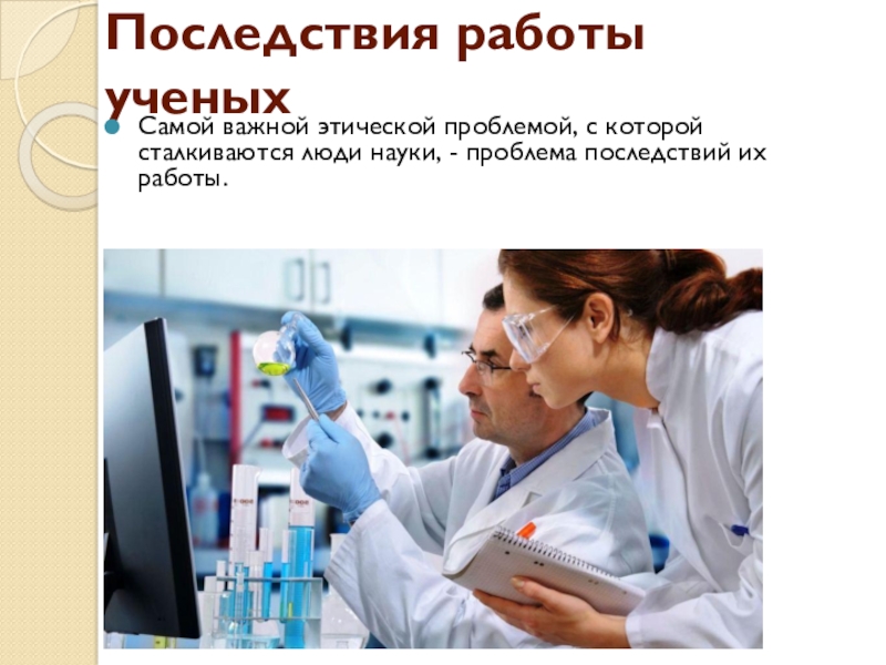 Последствия работы ученыхСамой важной этической проблемой, с которой сталкиваются люди науки, - проблема последствий их работы.