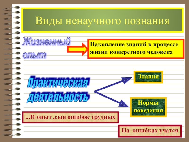 Виды ненаучного познанияЖизненный  опытПрактическая  деятельность...И опыт ,сын ошибок трудныхНа ошибках учатся
