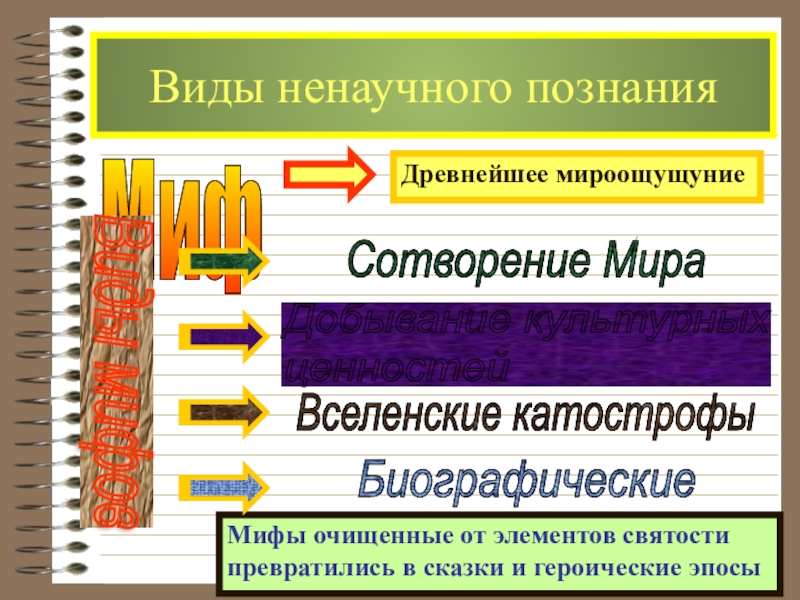 Виды ненаучного познанияМиф   Виды мифов Мифы очищенные от элементов святостипревратились в сказки и героические эпосы