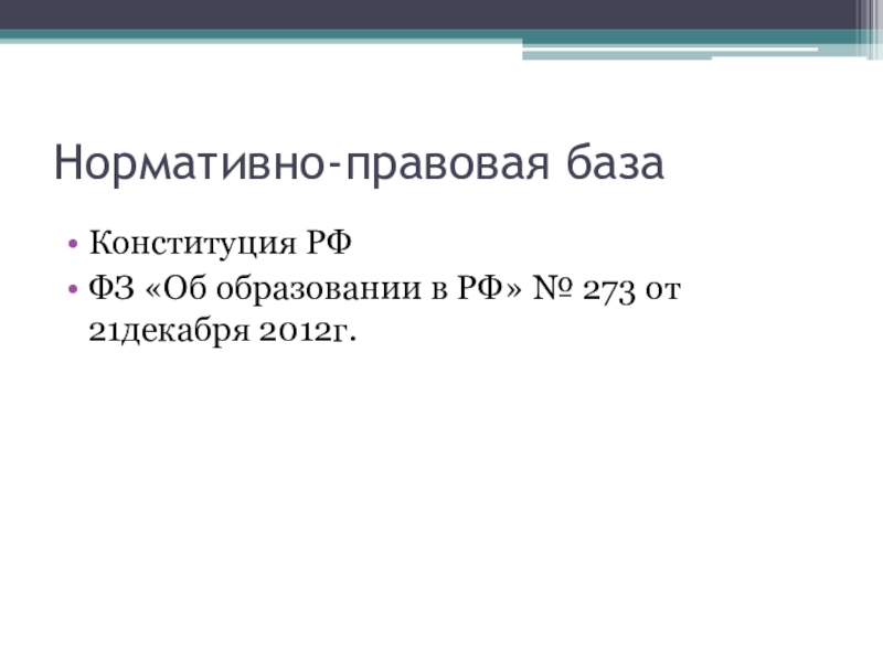 Нормативно-правовая база Конституция РФФЗ «Об образовании в РФ» № 273 от 21декабря 2012г.