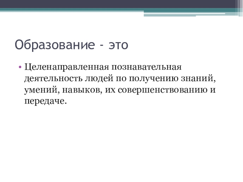 Образование - этоЦеленаправленная познавательная деятельность людей по получению знаний, умений, навыков, их совершенствованию и передаче.