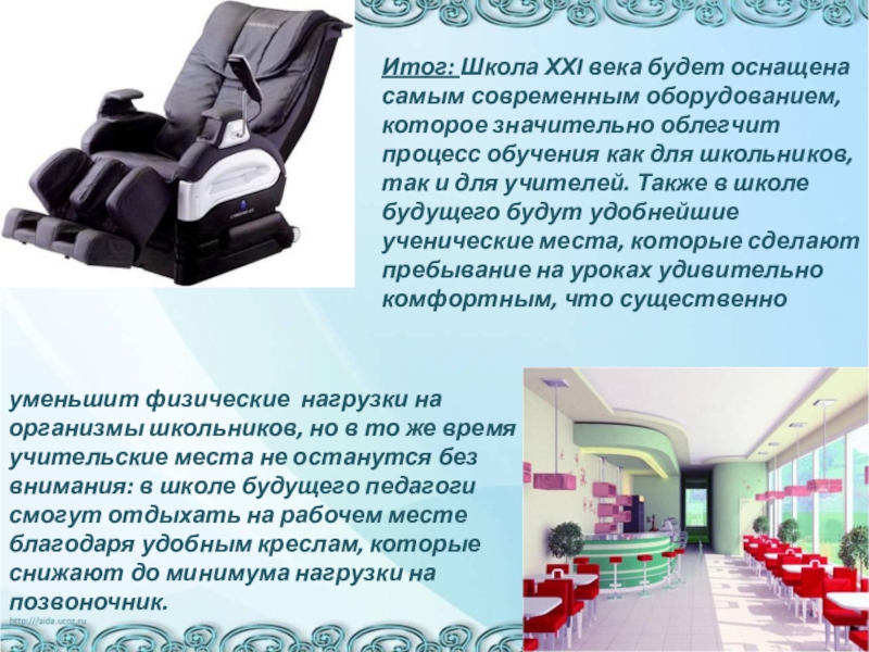 Итог: Школа ХХI века будет оснащена самым современным оборудованием, которое значительно облегчит процесс обучения как для школьников, так и для учителей. Также в школе будущего будут удобнейшие ученические места, которые сделают пребывание на уроках удивительно комфортным, что существенно
