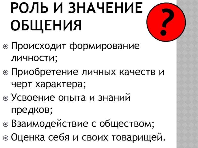 Роль и значение общенияПроисходит формирование личности;Приобретение личных качеств и черт характера;Усвоение опыта и знаний предков;Взаимодействие с обществом;Оценка
