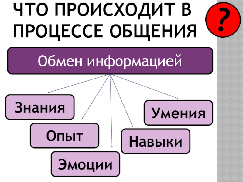 Что происходит в процессе общения?Обмен информациейЗнания Навыки Опыт Эмоции Умения