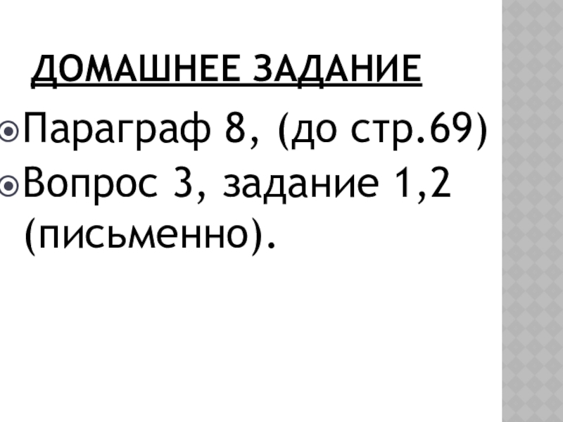 Домашнее заданиеПараграф 8, (до стр.69)Вопрос 3, задание 1,2 (письменно).