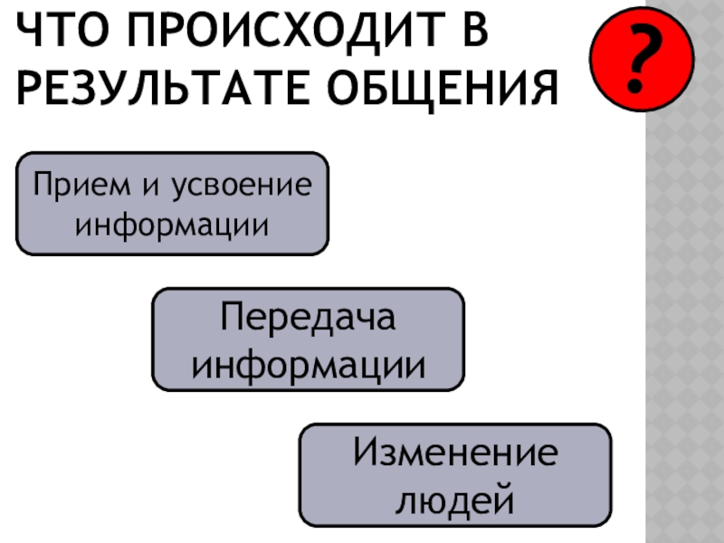 Что происходит в результате общения?Прием и усвоение информацииИзменение людейПередача информации