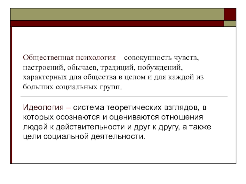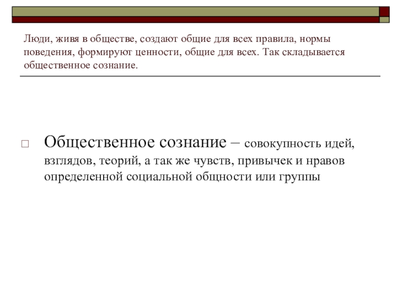 Общественное сознание – совокупность идей, взглядов, теорий, а так же чувств, привычек и нравов определенной социальной общности или группы