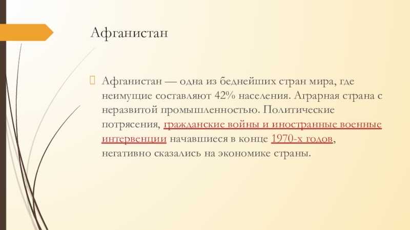 населения. Аграрная страна с неразвитой промышленностью. Политические потрясения, гражданские войны и иностранные военные интервенции начавшиеся в конце 1970-х годов, негативно сказались на экономике страны.