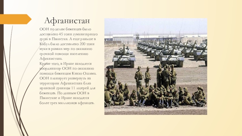 Кроме того, в Иране находится координатор ООН по оказанию помощи беженцам Кензо Ошима. ООН планирует развернуть на территории Афганистана близ иранской границы 11 лагерей для беженцев. По данным ООН в Пакистане и Иране находятся более трех миллионов афганцев.