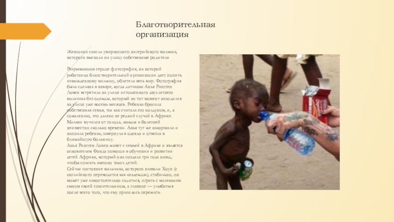 Разрывающая сердце фотография, на которой работница благотворительной организации дает попить изможденному малышу, облетела весь мир. Фотография была сделана в январе, когда датчанка Анья Рингген Ловен встретила на улице истощенного двухлетнего мальчика без одежды, который на тот момент находился на улице уже восемь месяцев. Ребенка бросила собственная семья, так как считала его колдуном, и, к сожалению, это далеко не редкий случай в Африке. Малыш мучился от голода, жажды и болезней неизвестно сколько времени. Анья тут же накормила и напоила ребенка, завернула в одеяло и отвезла в ближайшую больницу.