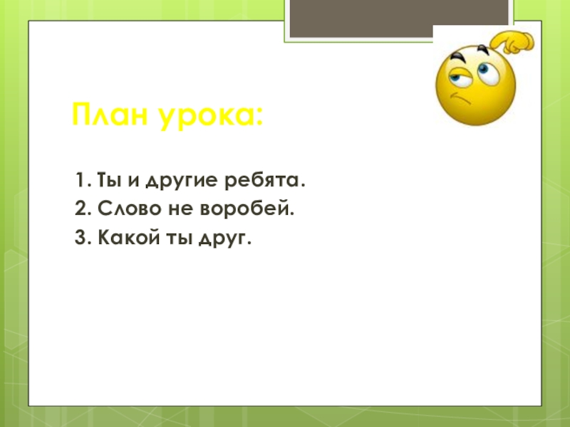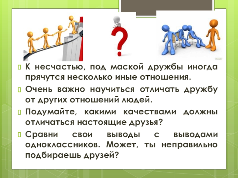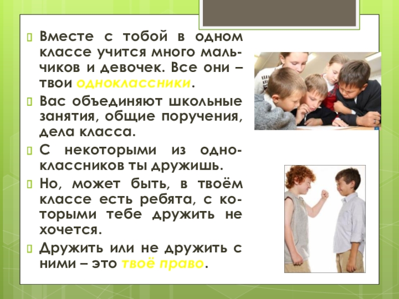 И вот ещё что: тех, кто тебе в классе не нравит-ся, ты не имеешь права обижать, смеяться над ними. Но это не значит, что ты не можешь раз-говаривать с ними или помочь в нужную минуту.